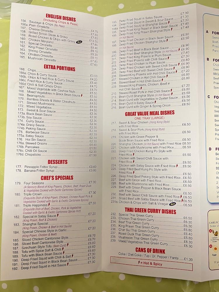 The Shanhai House menu boasts an impressive array of 158 dishes, showcasing a wide variety of Chinese cuisines. From traditional dishes like Chow Mein and Sweet and Sour Pork to specialties like the Shanghai Special and Triple Crown, there is something for everyone. Vegetarian options also abound, such as Mixed Vegetables Thai Green Curry, offering pleasing flavors without compromising on variety. A unique aspect of their menu includes late-night food, making it an ideal spot for night owls. The restaurant also features extra portions, allowing you to indulge further on side dishes like chips and fried rice. For dessert, their delicious fritters sweeten the experience, rounding off a satisfying meal.